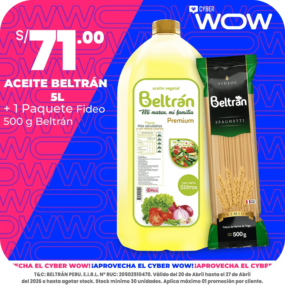 Aceite de Soya Beltrán 5L + Fideos Beltrán Spaguetti x20Unid