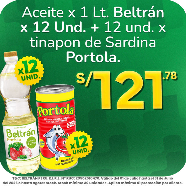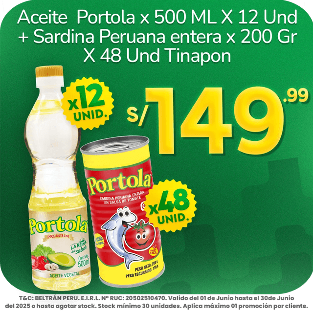 Aceite de Soya Beltrán 12 Uni + Tinapon de Sardina Portola 12 Uni