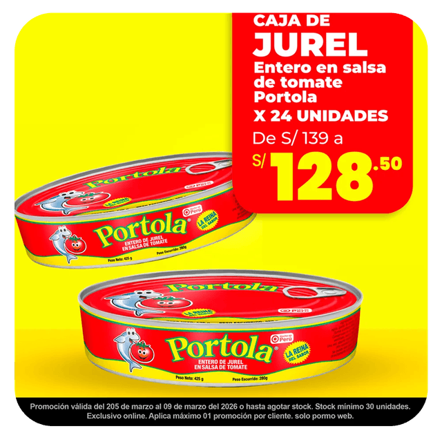 Aceite de soya Portola de 500ml 12 Uni + Sardina Peruana Entera c/- tomate de 200 gr 24 Uni